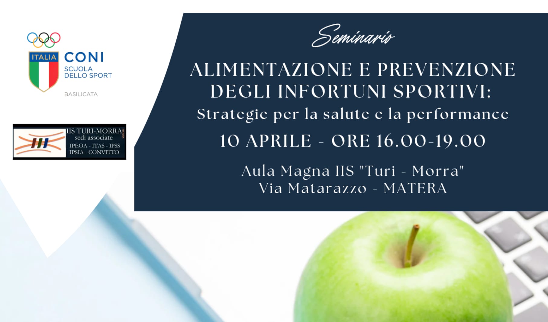 News 02 Apr 2026 A Matera il Seminario "Alimentazione e prevenzione degli infortuni sportivi" E' in programma per venerdì 10 aprile, dalle 16 alle 19, presso l'aula magna dell'SS "Turi-Morra" di Matera, il Seminario "Alimentazione e prevenzione degli infortuni sportivi: strategia per la salute e la performance". L'evento è organizzato dalla...